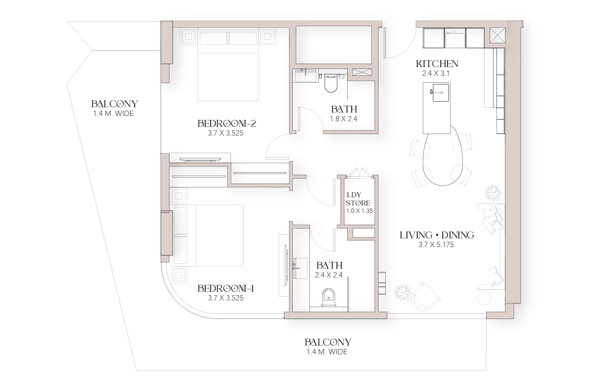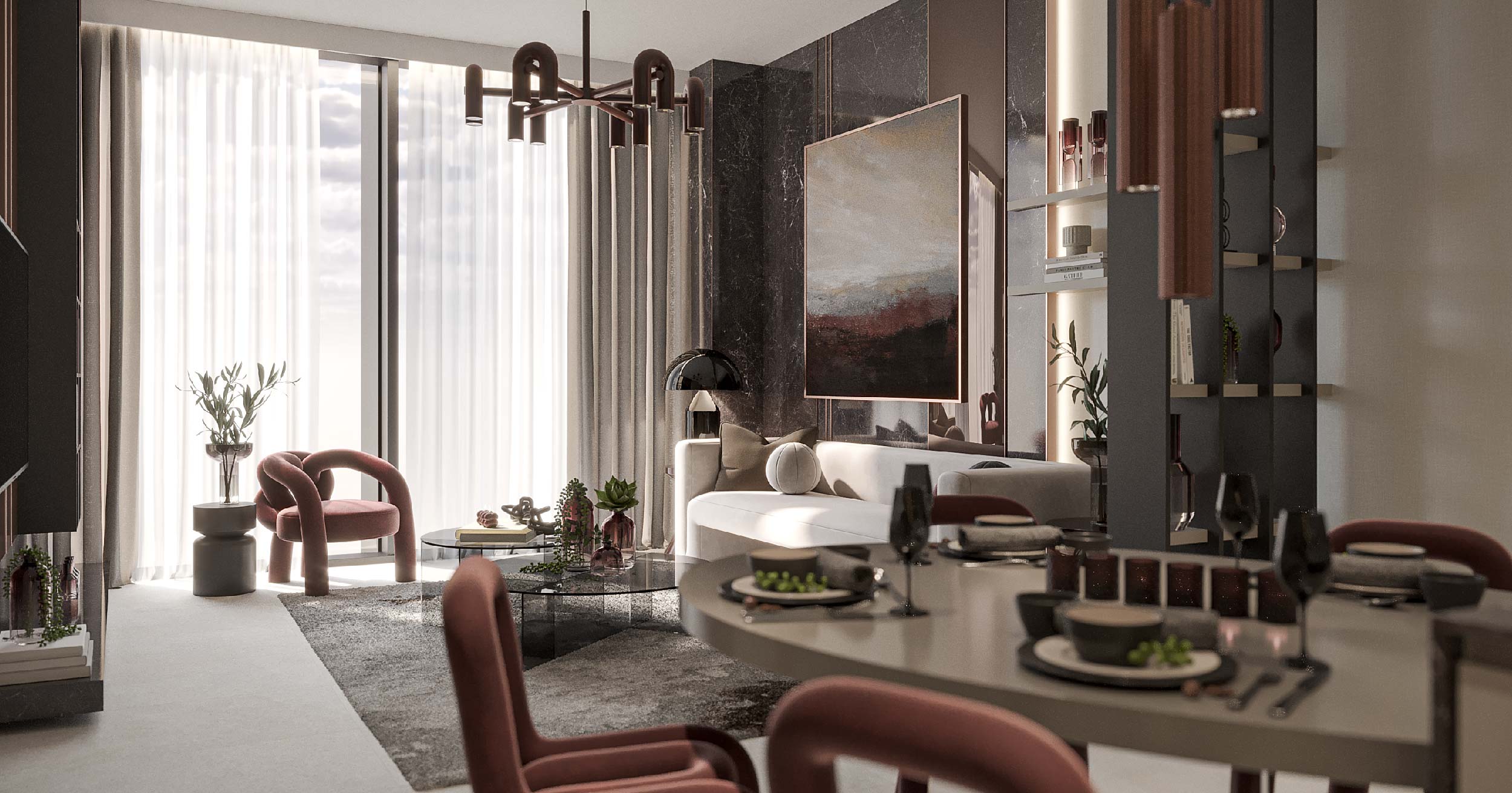 All units are fully furnished, allowing you to move into your residence immediately after the project's handover. The balconies offer stunning views of the emirate. The residences come with branded features, including purified drinking and sparkling water from GROHE, BOSCH appliances, Alexa smart home technology, a 65-inch Samsung TV, Italian tiles from Fondovalle, and high-quality sanitary ware.